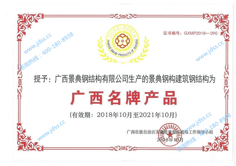 大港澳免费资科大全的“建筑钢结构”产品荣获2017年度广西名牌产品称号,产品品牌商标“景典钢构” ,有效期三年。